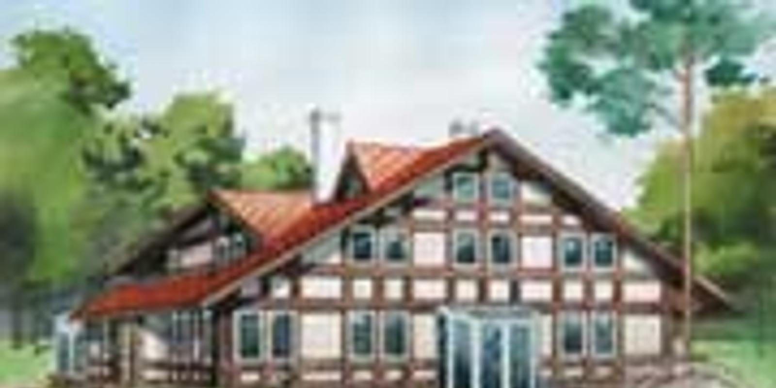 Терраса может быть не только пристроена к дому, но и располагаться на верхних этажах. Например, в этом доме (проект J-0838-0) с ярко выраженной старинной замковой архитектурой открытая терраса на первом этаже смотрелась бы нелепо. Однако хозяйка мечтала об утренних чаепитиях на свежем воздухе среди цветов. В результате крытая 15-метровая терраса была размещена на втором этаже на перекрытии над тамбуром. По сути потребовалось сделать только крышу, которая явилась продолжением основной кровли. Ограждающие конструкции второго этажа стали надежными стенами и для террасы.