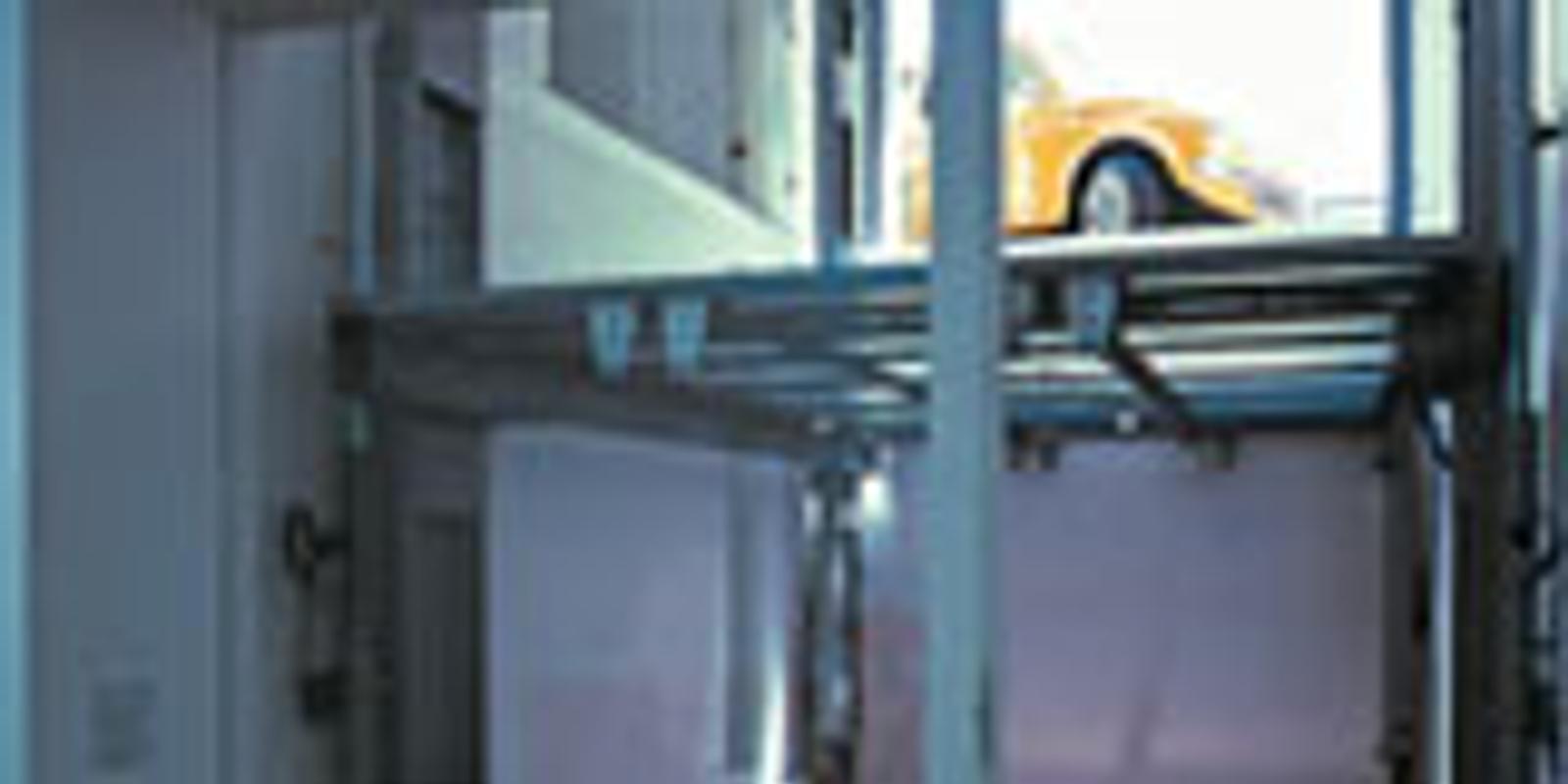 Чтобы интегрировать лифт в здание, верхняя площадка для автомобиля покрыта известняком. А нижняя представляет собой стальную раму, в которую вставлены прозрачные акриловые панели.