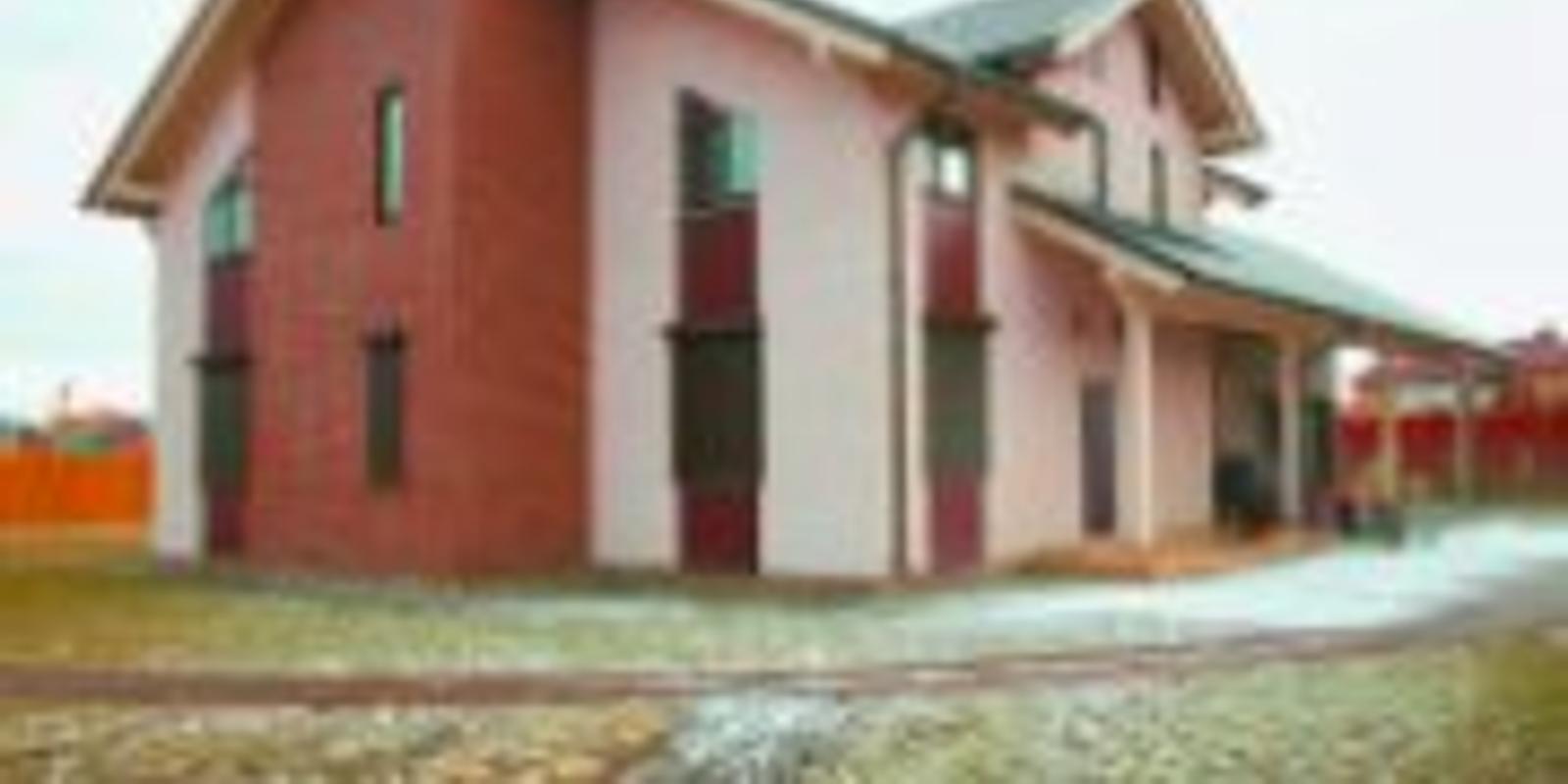 Внешняя отделка этого дома выполнена декоративной штукатуркой и панелями TermoKlinker, которые представляют собой современную высокотехнологичную систему, состоящую из теплоизоляционного материала пенополиуретана и высококачественного обожженного марочного клинкера. Они обеспечивают защиту от воды, пропускают водяной пар, что не мешает дому дышать, предохраняют наружные стены от трещин, обладают высокими теплоизоляционными свойствами, что снижает затраты на отопление. Снаружи панели выглядят как обычный облицовочный кирпич. Завершают образ дома низкий цоколь, декорированный камнем, кровля, покрытая металлочерепицей, и деревянные окна.