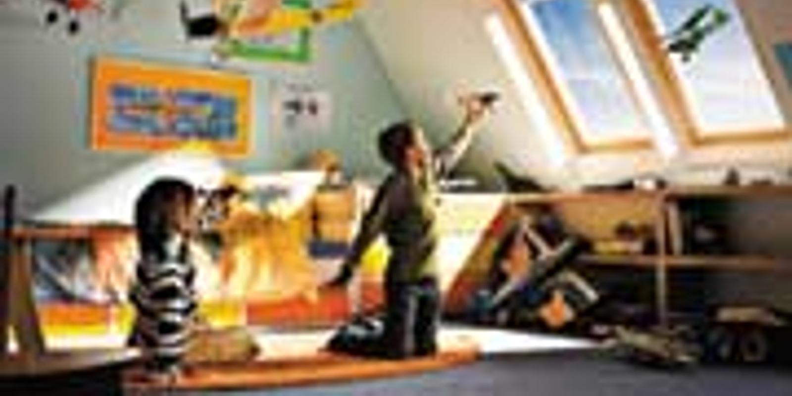 Детскую комнату со шведской стенкой и уголком спортивных тренажеров в мансарде по достоинству оценят маленькие домочадцы. Но в подвижных играх могут случиться всякие неожиданности, и их следует предусмотреть. Поэтому здесь рекомендуется применять окна, укомплектованные безопасными стеклами «триплекс» – они прочнее обычных стекол, но даже если такое стекло разбивается, осколки не осыпаются, а остаются на пленке. Не менее важно, что ручка для открывания с фиксирующей щеколдой расположена сверху (как например, VELUX GGL), а значит, дети не смогут самостоятельно открыть окно.