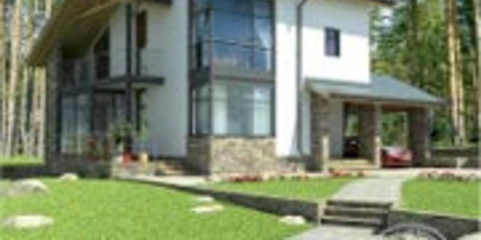 И наконец, имеется вариант, хотя и сравнительно молодой, но довольно перспективный, особенно для применения в загородном строительстве – вентилируемый фасад. Именно такая модификация предлагается для проекта J-1386-0, стильного, современного коттеджа с красиво решённым угловым остеклением.