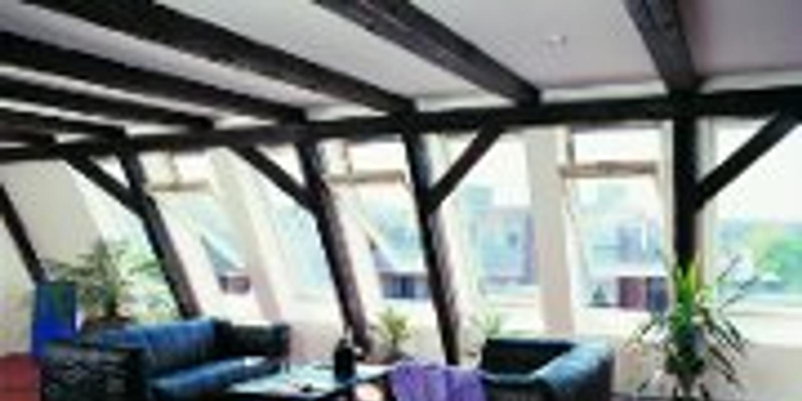При реконструкции чердака обнажили стропильную конструкцию и установив мансардные окна, добились впечатления остекленной стены.