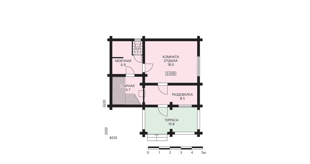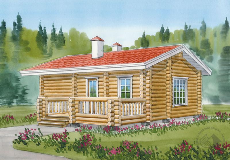 Очень удобная, уютная бревенчатая баня. Она имеет относительно большое пятно застройки, которое вместе с террасой составляет 8х8.5 м. Достаточно большая площадь постройки позволила разместить здесь необходимое количество помещений, делающих планировку удобной и комфортабельной. Чего стоит одна комната отдыха – просторное, светлое помещение, предполагающее оборудование мягкой мебелью, аудио- и видеотехникой. Непосредственно банный комплекс представлен парной, моечной и санузлом. В моечной возможна установка бойлера. Растопка печи организована из раздевалки, это может быть электрокаменка или дровяная печь. Предваряет вход в баню терраса. Это сооружение без особых затей и внешних изысков может стать излюбленным местом проведения досуга вашей семьей.