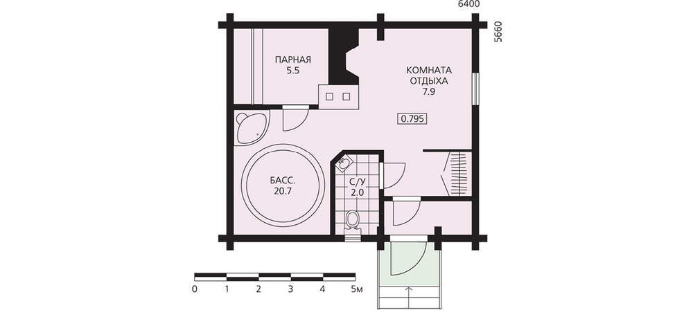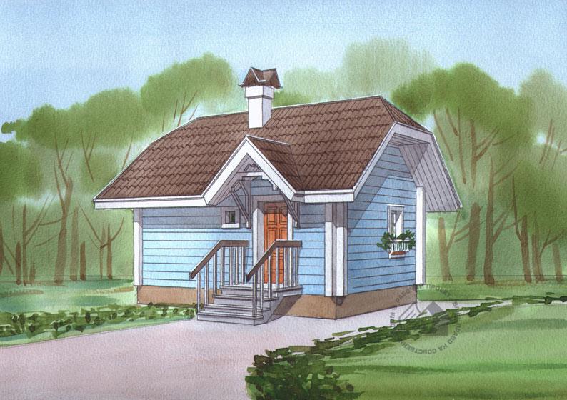 Небольшая, но достаточно комфортабельная баня, в которой даже нашлось место бассейну. Все решено предельно компактно. Почти квадратная в плане, со сторонами. равными размеру бревна, внешне очень непритязательная, но вполне соответствующая стилистике аналогичных объектов, она сможет стать необходимым дополнением вашей усадьбы. Уютное крытое крылечко, тамбур ведут в комнату отдыха. Это небольшое светлое помещение с камином. Рядом и очень удобно с парной расположен небольшой бассейн. На небольшой чердак можно попасть с улицы.