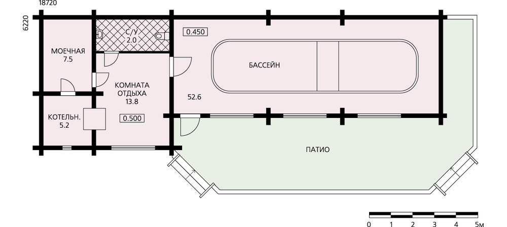 Этот небольшой оздоровительный комплекс может быть построен на территории частной усадьбы и служить очень приятным дополнением, повышающим комфорт проживания владельцев этой усадьбы. Вполне возможно использовать его и как объект инфраструктуры в небольшом коттеджном поселке. Здание одноэтажное с достаточно простым объемно-планировочным решением. Торцевые фасады глухие, немногим больше площадь остекления и на заднем фасаде, что позволит вписать дом в красную линию застройки. Условно его можно разделить на три части: помещение для бассейна с чашей длиной 9.5 м, сауна с сопутствующими помещениями и патио – просторная, частично спрятанная под крышу терраса. Удобное расположение комнаты отдыха между бассейном и сауной позволит отдыхать здесь и после заплыва в бассейне, и после сеанса в парной. С удовольствием отдохнуть можно и на террасе, особенно в хорошую теплую погоду. На террасу обращены и большие окна-витражи из бассейной, благодаря которым эти два пространства сливаются в единое целое.
