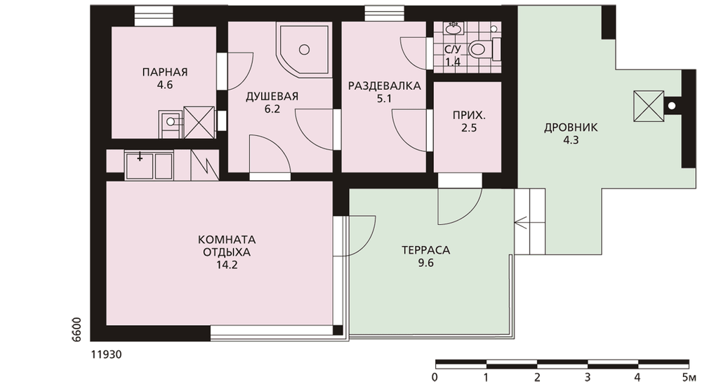 Просторная каркасная баня, в которой есть все необходимое: раздевалка, душевая, парная и комната отдыха, окна которой выходят на квадратную террасу. Уличный гриль под навесом позволит сразу после водных процедур заняться приготовлением шашлыка.