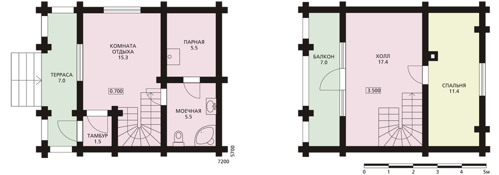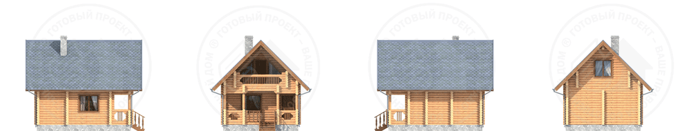 Баня по представленному проекту соединяет в себе комфорт классического деревянного дома с удобствами сауны. На первом этаже расположена просторная комната отдыха с выходом на террасу; она предполагает выход на озеро. Там же находится сердце русской бани - парная с большой моечной. Второй этаж представляет собой жилую зону: здесь расположен просторный холл с балконом и даже уютная спальня, поэтому баня вполне может использоваться в качестве гостевого дома.