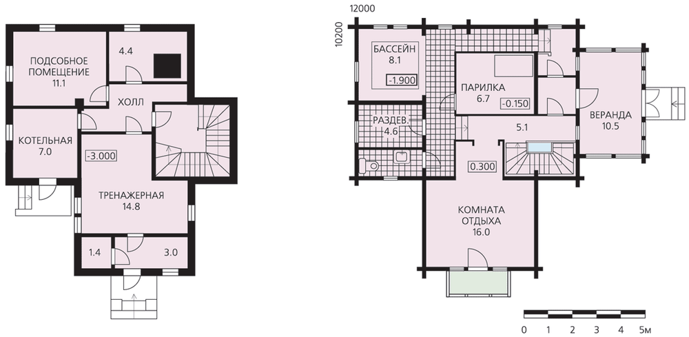 Небольшой оздоровительный комплекс разработан для строительства на рельефе, возможно, на берегу озера или реки (перепад рельефа – до 4 м). Постройка представляет собой деревянный сруб, стоящий на бетонном основании. Входная зона запроектирована на уровне первого этажа и начинается с просторной веранды. В небольшом, компактном объеме размещены баня с бассейном, раздевалка и другие необходимые помещения. Комната отдыха с балконом является ядром первого этажа. Внутренняя лестница связывает первый этаж с цокольным, в котором расположены подсобные помещения и тренажерная. Высокая крыша постройки, помимо образного решения, имеет еще и функциональное назначение: полученное чердачное пространство вполне может быть использовано как подсобная площадь.