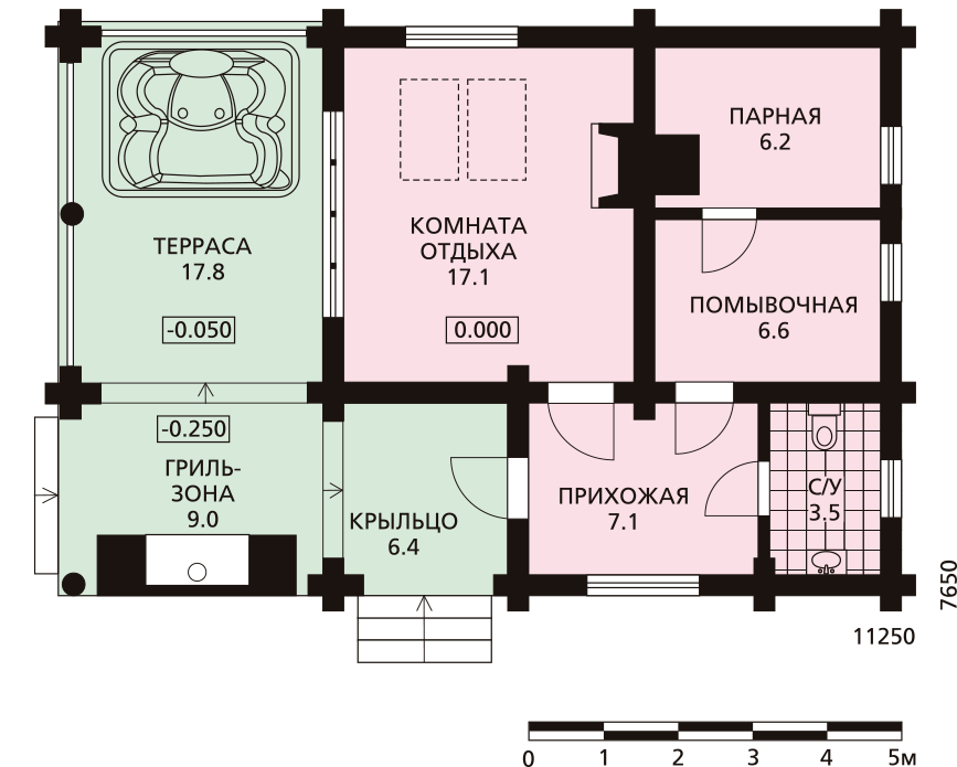 Бревенчатая баня, в которой есть все необходимое: раздевалка, душевая, парная и комната отдыха, окна которой выходят на просторную террасу. Уличный гриль под навесом позволит сразу после водных процедур заняться приготовлением шашлыка.