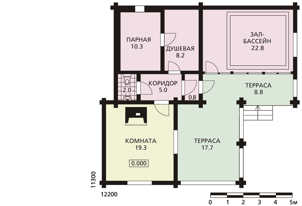 Небольшая уютная баня из профилированного клееного бруса. В бане можно не только помыться и попариться, поплавать в бассейне, но также отдохнуть в комнате с камином. После водных процедур в теплое время года можно собраться компанией на просторной террасе.