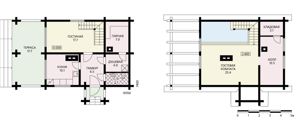 Маленький, очень уютный дом-баня для отдыха. О бане здесь напоминают парная и душевая. Гостиная и столовая, расположенные на первом этаже, и гостевая мансарды – традиционные элементы жилья. В этом доме можно с комфортом отдохнуть несколько дней небольшой компанией. А можно использовать его и как гостевой дом-баню на вашей усадьбе. При том, что внешний облик дома достаточно традиционен, он очень привлекателен. Это достигается за счет выверенных пропорций и качественных отделочных материалов. Вход в дом предваряет небольшое крылечко с высоким фронтоном. Центрально расположенный тамбур – распределительная зона дома, сюда выходят все помещения первого этажа: гостиная, кухня, душевая с парной и санузел. Открытая деревянная лестница из гостиной ведет в мансарду, где расположена достаточно просторная антресоль, которая вполне может служить спальней.