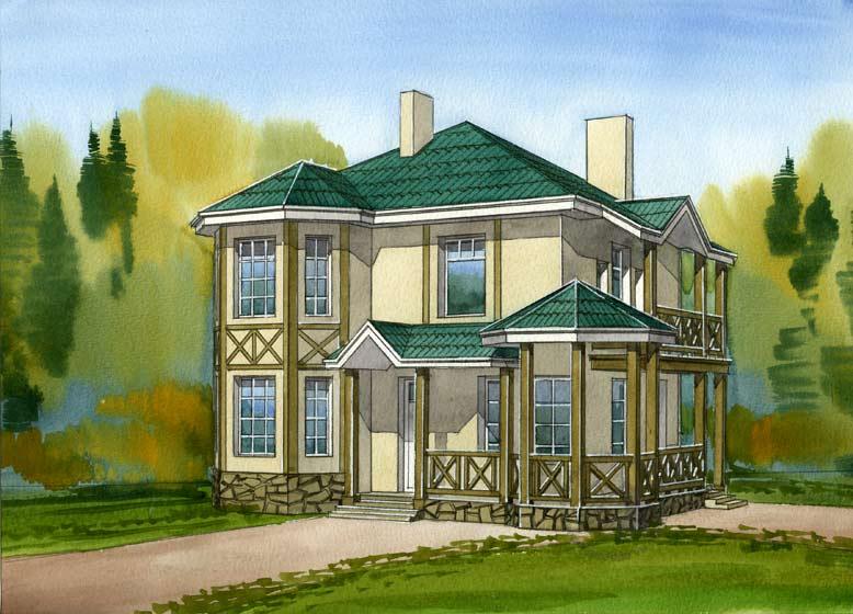 Небольшой коттедж,с достаточно традиционным для загородного строительства решением, изюминкой планировки которого бесспорно является симпатичная угловая беседка. Она решена как часть единой композиции дома, в той же стилистике с теми же характерными элементами, при этом очень удобна. Можно предположить, что она будет излюбленным местом отдыха семьи. В доме два этажа и неэксплуатируемый чердак, подвал отсутствует. План прямоугольной формы с выступающим эркером. Главный и боковой фасады огибает терраса. На первом этаже расположены три жилые помещения: гостиная, кухня-столовая и небольшая спальня. Гостиная с камином и трехгранным эркером – самое парадное помещение дома. На втором этаже проектом предусмотрены три спальни и кабинет, который, впрочем, также может использоваться как спальня. Из двух смежных спален есть выходы на балкон. Высота этажей в доме составляет 3 м.
