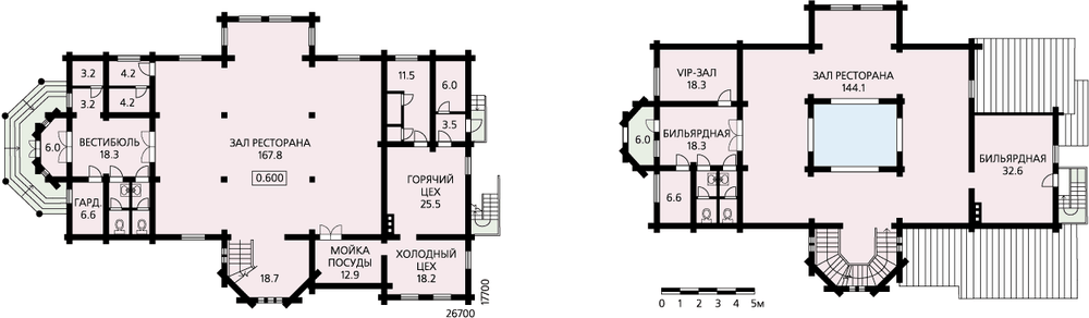 Бревенчатый ресторан с башней, внешне экзотичный – внутри функциональный и удобный. Особенно удачно его архитектура будет сочетаться с живописным окружением средней полосы России. Своеобразие внешнему облику придает башня с шатровой кровлей. На ее смотровую площадку можно подняться из зала ресторана. Здание двухэтажное. Вход для посетителей организован с торца. Первый этаж функционально поделен на три зоны: рекреационную, собственно зал ресторана и служебную. В центре рекреационной зоны, предваряющей зал ресторана, находится вестибюль. По одну сторону от него расположены помещения охраны, по другую – гардероб и санузлы. Зал ресторана – большое, в центре двусветное помещение с барной стойкой и подиумом для оркестра. Служебный блок представлен горячим и холодными цехами, мойкой, кладовой и комнатой персонала. Он имеет служебный выход на улицу. На втором этаже расположен еще один зал ресторана, плюс к этому имеется небольшой VIP-зал и бильярдная. На первый этаж можно спуститься по трехмаршевой лестнице как из зала ресторана, так и из бильярдной.