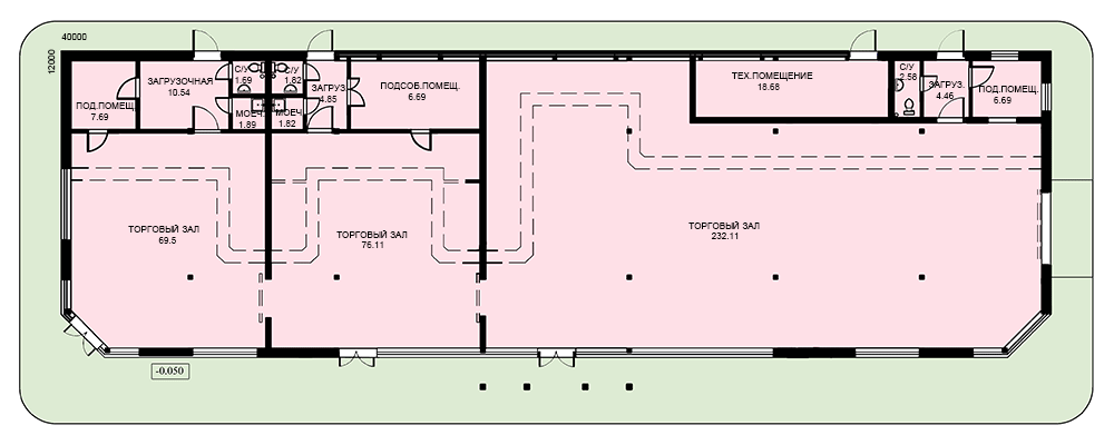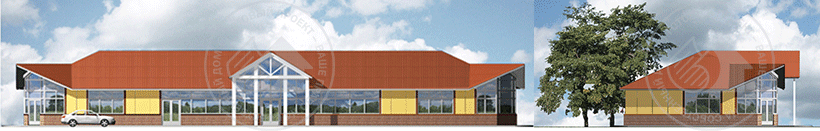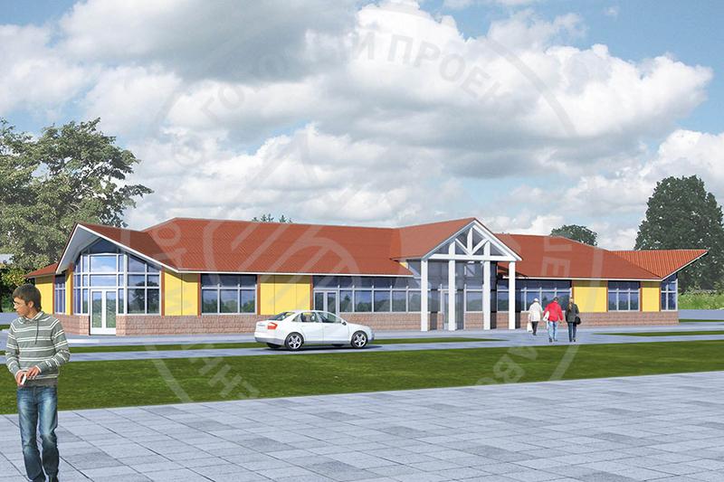 Одноэтажный магазин представляет собой прямоугольный объем, имеющий в плане размеры – 40 х 12м. Магазин объединяет три зоны: - продуктовый отдел; - отдел бытовых товаров, - отдел стройматериалов . Запроектированы три независимых входа для посетителей в каждый отдел. Загрузка товаров и вход персонала осуществляется с бокового и заднего фасада. В магазине запроектированы: три торговых отдела, подсобные помещения для персонала, моечные и санузлы персонала. Здание покрыто 2-х скатной крышей с врезанными декоративными фронтонами. Центральная часть выделена входным портиком на деревянных стойках.