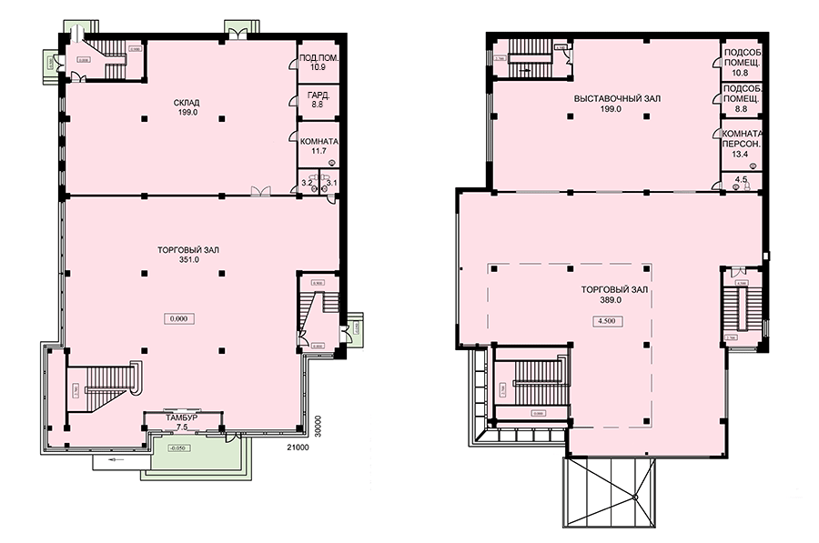 Магазин представляет собой двухэтажное здание. Большой козырек - навес ведет от парковки в торговый зал первого этажа. На первом этаже расположены торговый зал и складская зона. На втором этаже –торговый и выставочные залы. Торговые залы первого и второго этажей соединены открытой парадной лестницей. Зал второго этажа имеет верхний свет через фонарь на кровле. Кроме того, в салоне находятся офисные помещения, санузлы, гардероб персонала, технические и подсобные помещения. В здании имеется две эвакуационные лестничные клетки типа.