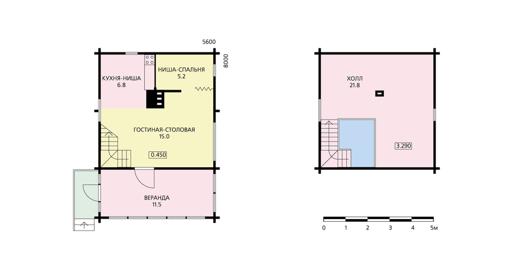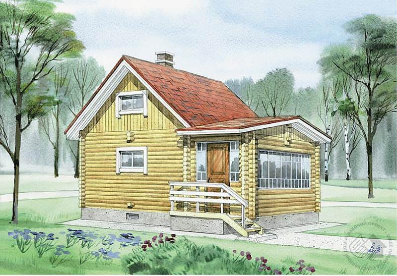 Вариант дачного бревенчатого дома с компактной планировкой и лаконичными фасадами. Основной объем дома в плане имеет квадрат со сторонами 5,6 х 5,6 м. В нем и размещены основные помещения: гостиная-столовая, кухня и ниша-спальня. Так как деление пространства этого этажа на помещения условное, то возможны различные варианты его планировки и использования. По открытой лестнице из гостиной можно попасть на мансардный этаж, где по проекту предполагается размещение холла. Но его площадь, освещенность и высота подстропильного пространства позволяют разместить здесь одну или две полноценные жилые комнаты. Пристроенная к основному объему веранда в летний период может служить столовой. В доме предполагается печное отопление.