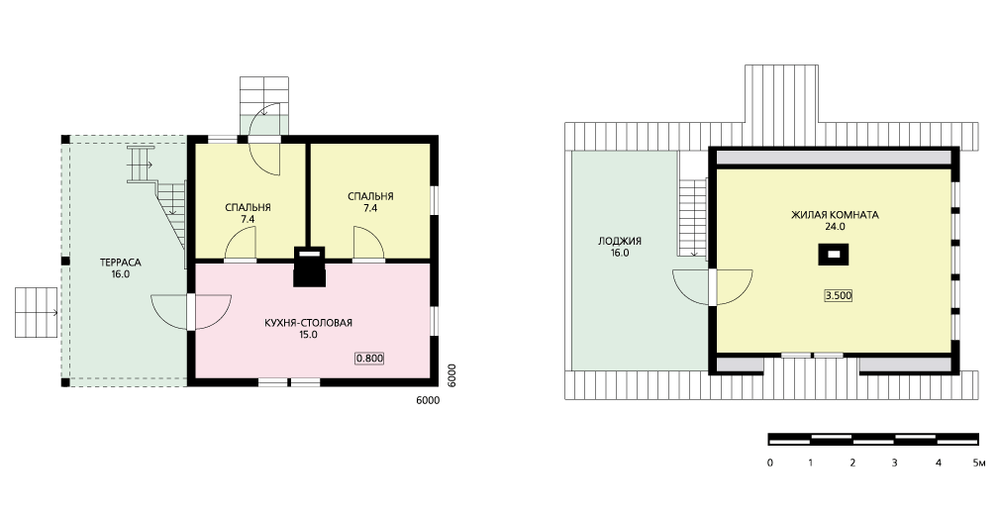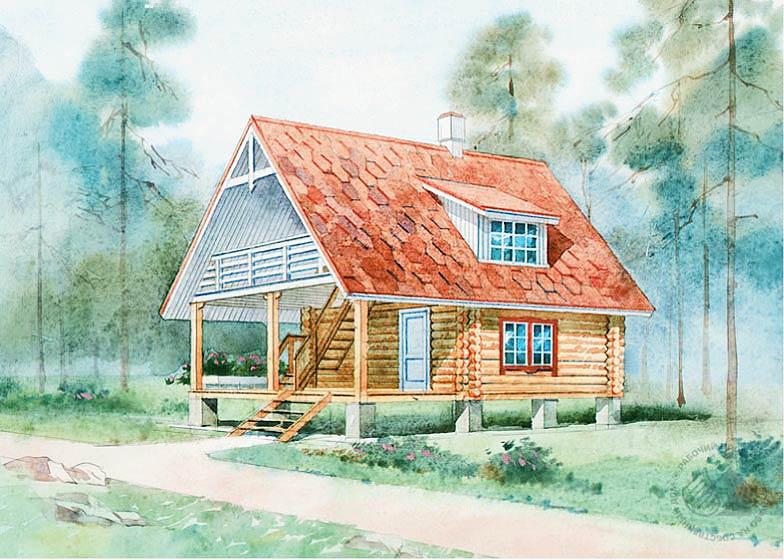 Небольшой дачный дом отлично подойдет для дачных и садоводческих участков. Особенность планировочного решения – отсутствие подвала – позволит построить дом на участках с высоким уровнем грунтовых вод. Постановка бревенчатого сруба на бетонные столбики создает дополнительную защиту постройки от влаги. Пространство дома решено просто и экономично. Большая терраса-лоджия – входная зона дома. Общая комната-кухня оборудована печью, которой можно обогреть все помещения дома. В двух небольших спальнях первого этажа и просторном помещении мансарды может разместиться семья из 4 человек.