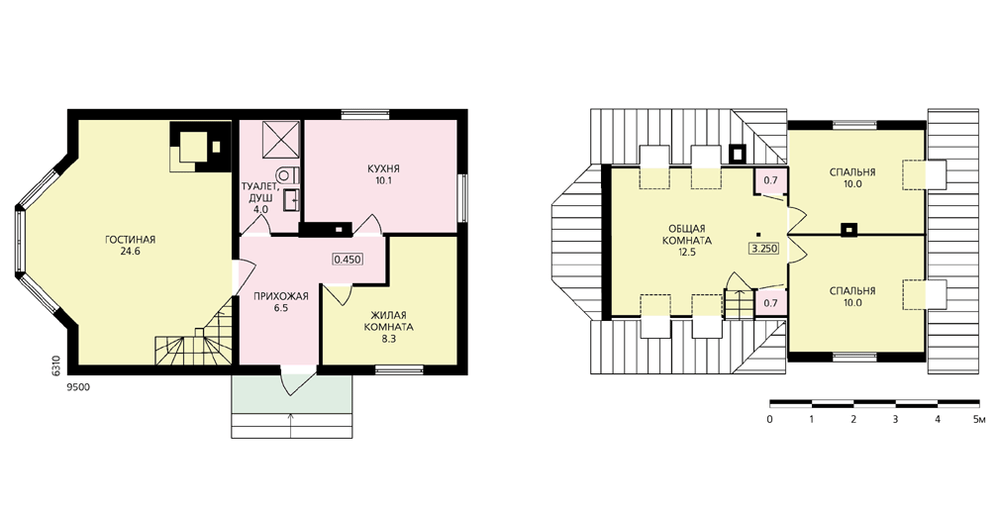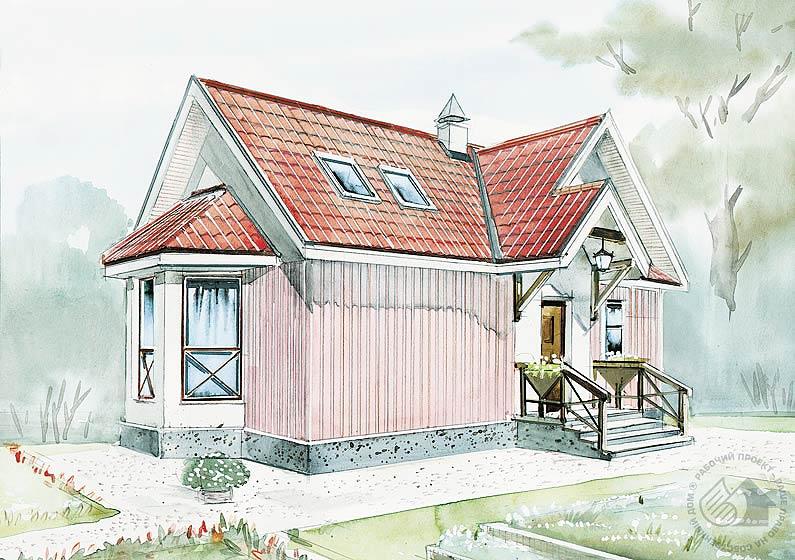 Небольшой по площади жилой дом предназначен для людей со средним уровнем доходов. Вместе с тем его планировка и архитектурные решения позволяют создать комфорт и дают возможность оформить интерьеры в соответствии со вкусами хозяев. Большая гостиная привлекательна наличием остекленного эркера, камина и лестницы, ведущей в мансарду. Установка специальных мансардных окон превращает комнаты мансарды в современные и эстетически интересные помещения. Планировка дома позволяет осуществить зонирование по этажам, расселив в первом этаже старшее, а во втором – младшее поколение.