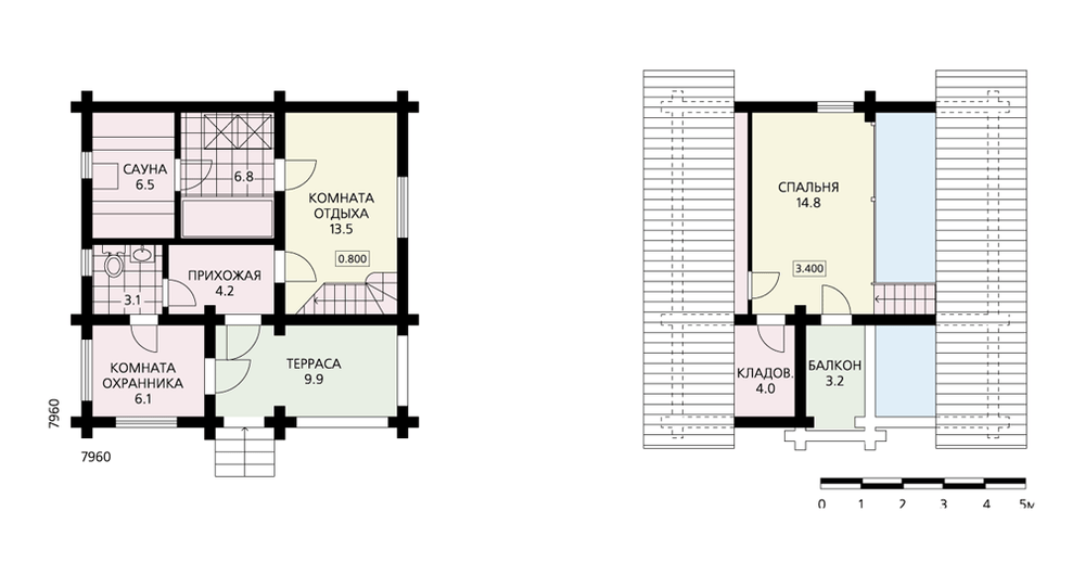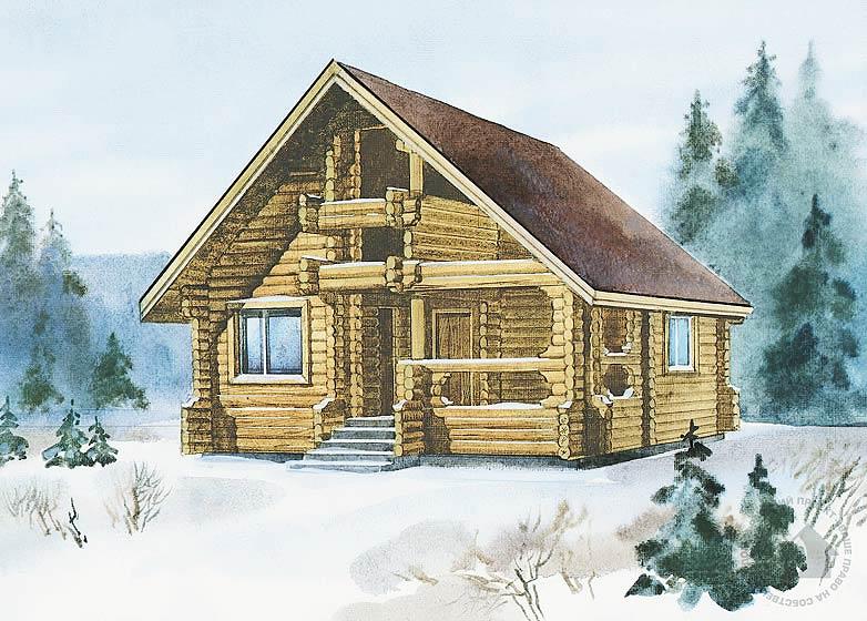 Владельцы садового участка по достоинству оценят и «деревенский» облик дома, и высокий уровень комфорта, предложенный авторами. Дом также может стать одной из построек усадебного комплекса, например – гостевым домиком или использоваться как баня. Планировка квадратного в плане объема решена предельно рационально и продуманно. Входное крыльцо-терраса связано с комнатой охраны и прихожей. При желании сауну можно сделать компактнее, а одно из помещений этого блока (душевую) отдать под что-то более необходимое владельцам. При необходимости за счет перестановки перегородок можно изменить назначение и габариты каждого из помещений, сохранив образ дома и его основные размеры.