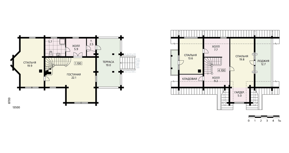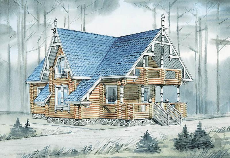 Небольшой деревянный дом будет удобен как сезонное или как постоянное жилье. Материал стен, характерные для бревен соединения, декоративные элементы фронтонов и крыльца создают образ русского усадебного дома. В планировке использованы современные приемы решения пространств. В большей мере это касается гостиной с зоной отдыха в сильно выступающем эркере и зоной кухни, расположенной под открытой лестницей. Спальня первого этажа вполне может быть переоборудована под кухню-столовую. Небольшая перепланировка второго этажа позволит владельцам получить другое решение спальной зоны, возможно, более приемлемое для конкретной ситуации. В частности, можно оборудовать еще одну жилую комнату на месте холла.
