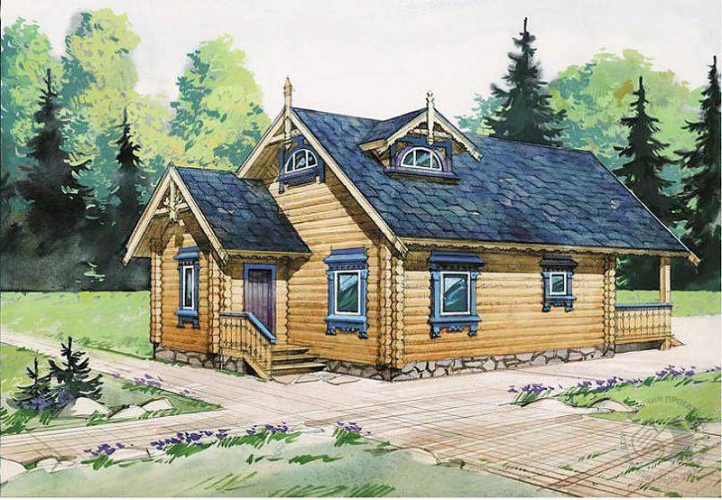 Небольшой, компактный и очень уютный дачный домик. Небольшие размеры, простота конструктивного решения и возможность быстрого возведения позволят использовать его как временную постройку при возведении основного дома на участке. Впрочем, ничто не мешает использовать его и как самостоятельную постройку. Дом имеет два входа, один – через входной тамбур и второй – через террасу. Для увеличения полезной площади дома террасу можно остеклить. В мансарде находятся одна спальня и лестничный холл, который в дачных условиях вполне может использоваться как жилое помещение.