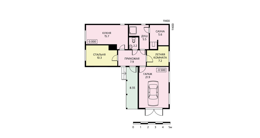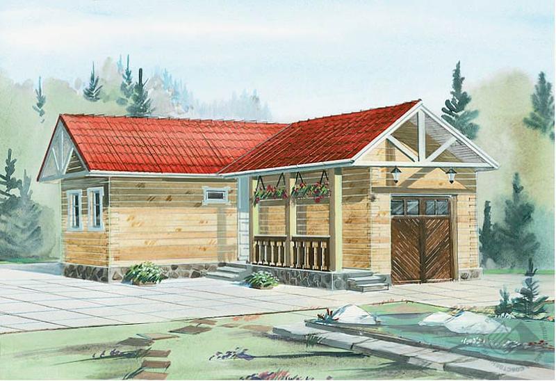 Деревянный одноэтажный дом для постоянного или временного проживания может иметь различные версии функционального использования на основе одного планировочного решения: первая – гостевой дом-флигель на участке с «хозяйским» особняком для постоянного проживания (в представленном варианте), вторая – самостоятельное жилище, с учетом устройства вместо гаража большой кухни-столовой и вместо кухни (обозначенной на плане) – второй спальни. Экономичность постройки очевидна и обеспечена простым планировочным решением и строительным материалом – деревом.