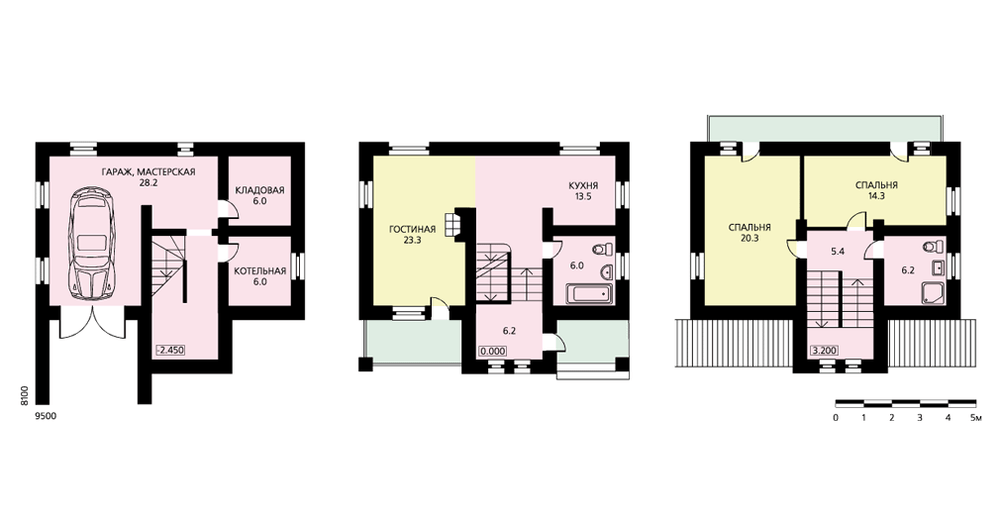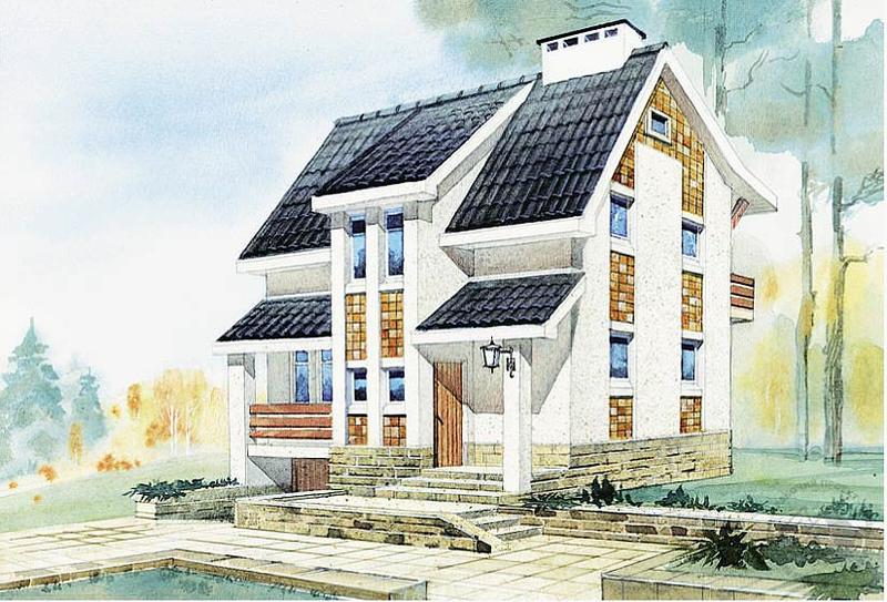 Небольшой, но очень милый загородный дом с тщательно прорисованными фасадами и продуманной планировкой. В отделке фасадов применено сочетание лицевого кирпича или декоративной плитки и штукатурки. Сдвоенные небольшие оконные проемы создают иллюзию большего фасада. В планах все логично: прихожая, гостиная, связанная через небольшой холл с кухней, и санузел – на первом этаже, две большие спальни и ванная – на втором. Балкон гостиной комнаты служит навесом над въездом в гараж. Кроме того, в цокольном этаже находятся мастерская, кладовая и котельная.
