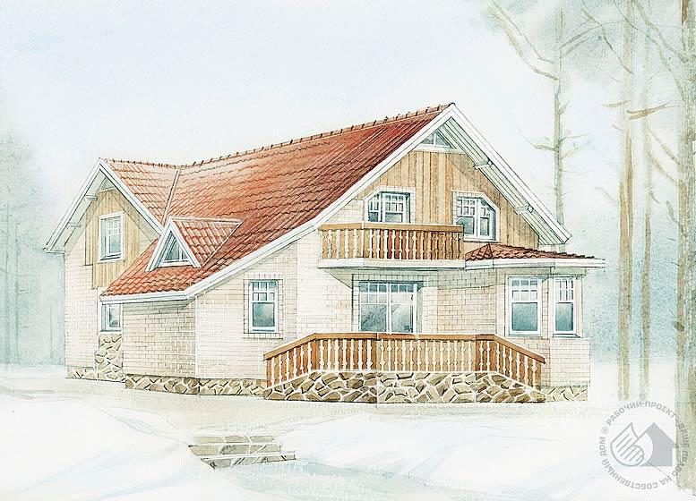 Двухэтажный дом комбинированной конструкции спроектирован для просторных живописных участков с плоским рельефом. Ограничений по грунтам практически не существует. Здание выглядит приземистым, но при этом дом очень вместителен – помимо общих комнат (кухни-столовой и гостиной в эркере) в нем имеется пять спален. Помещения второго этажа – мансардного типа. Для увеличения их освещенности и обогащения интерьерного пространства можно использовать мансардные окна. В предлагаемом варианте дом отапливается двумя печами (одна совмещена с камином), что особенно удобно при сезонной эксплуатации жилья.