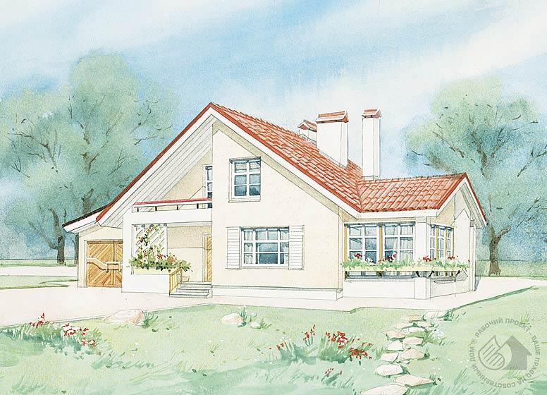 Дом с классической уравновешенной композицией фасадов и практичной рациональной планировкой помещений. Такой дом удобен для семьи, занятой работой на приусадебном участке или в фермерском хозяйстве. Этим определяется расширенный состав подсобных хозяйственных помещений, наличие дополнительных кладовых и веранды при кухне, устройство, помимо парадного крыльца, двух дополнительных выходов на участок. Внутренняя планировка лаконична и удобна – жилая часть дома вписана в квадрат и организована вокруг двусветного холла с лестницей. Второй этаж решен в виде мансарды, что дает экономию материалов и сокращает затраты на отопление. Также в доме предусмотрен подвал, расположенный на отметке –2.2 м под кухней (на планах не показан).