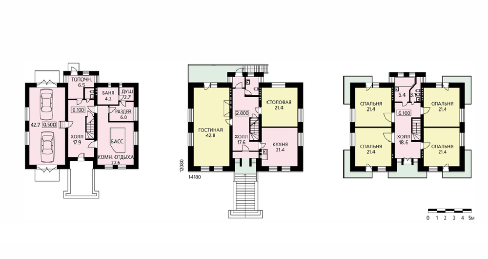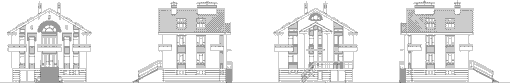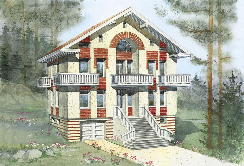 Респектабельный особняк для взыскательных владельцев. Все помещения расположены в наземных этажах, что позволяет не принимать в расчет наличие высокого уровня грунтовых вод на участке. В цокольном этаже находятся подсобные помещения, баня, комната отдыха с бассейном и гараж. На первом этаже – группа помещений дневного пребывания: большая гостиная, кухня и столовая. На втором этаже находятся спальни с балконами, которые могут быть превращены в застекленные лоджии. Широкая лестница главного входа усиливает впечатление парадности постройки, отлично вписывающейся в природное окружение.