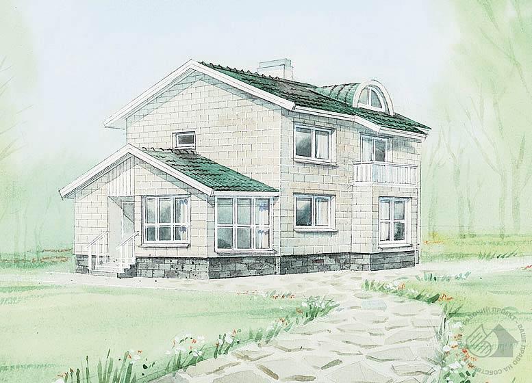 Очень экономичный двухэтажный дом для постоянного проживания семьи решен с предельным рационализмом. Тамбур входной зоны соединен с верандой, что позволит экономить тепло в доме в холодные дни. Просторная кухня может быть использована как столовая. Общая комната отделена раздвижной перегородкой от расположенной рядом спальни и при необходимости может быть увеличена до 35 м2. Принятые строительные материалы делают этот дом простым в исполнении и привлекательным для возведения в короткие сроки.