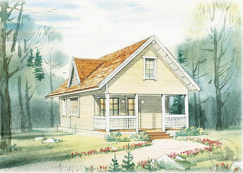 Небольшой каркасный дом, в компактный план которого вписаны все помещения, обеспечивает комфорт летнего отдыха семье. Роль входной зоны выполняет просторная терраса, которую можно превратить в веранду или, утеплив, в жилое помещение. Зона кухни в едином пространстве большой гостиной выделена открытой деревянной лестницей, ведущей в мансарду. Жилая комната первого этажа может стать детской, гостевой, кабинетом. Не исключена возможность увеличения гостиной за счет этой комнаты. В мансардном этаже находятся две спальни. Дом легко сделать пригодным для постоянного проживания, выполнив необходимое дополнительное утепление и оснастив его источником тепла.