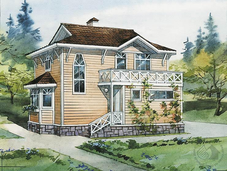 Этот двухэтажный дом – отличный вариант для владельцев небольшого участка. Предельно компактный план, изысканный облик и экологичные строительные материалы – все это может быть по достоинству оценено заказчиками с высокими требованиями к будущему жилью. Планировка дома рациональна и достаточно универсальна. Просторная гостиная с великолепным эркером, камином и лестницей является ядром планировки дома. Не исключена возможность устройства открытых пространств. Так, кухня может не иметь перегородки, отделяющей ее от холла. В гостиной вместо двери можно устроить большой проем. На втором этаже при желании легко оборудуется небольшой санузел.