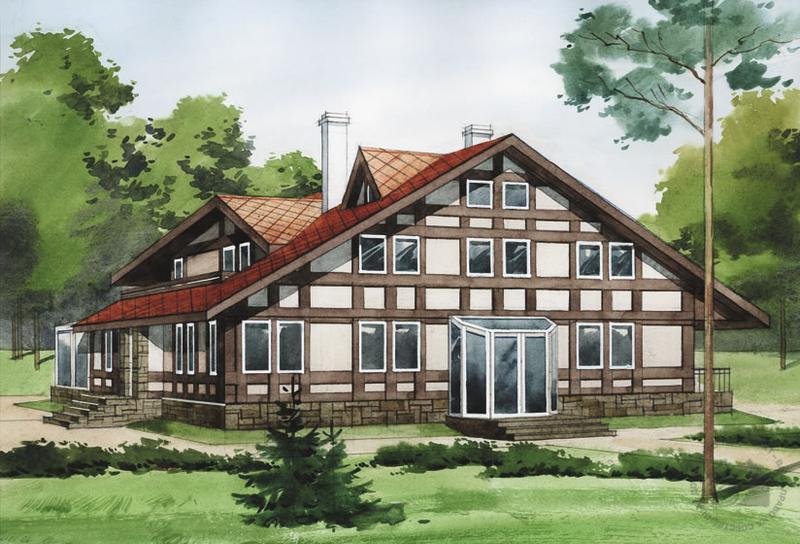 Большой по площади кирпичный дом может быть интересен как решением внутренней планировки, так и приемом оформления фасадов. В проекте предлагается зашивка наружных стен пластиковыми панелями, имитирующими фахверк. Дом имеет два по-разному ориентированных входа, что облегчает его посадку на участке и ориентацию по сторонам света. В проекте не предполагается четкого поэтажного зонирования. На первом и мансардном этажах спальни соседствуют со столовой и гостиной. Но планировка, выполненная в перегородках, достаточно условна и может быть изменена. Так, на первом этаже на месте кухни, гостиной и смежной с ней спальни возможно организовать единое многофункциональное помещение дневного пребывания. В мансарде можно объединить пространство холла и гостиной.