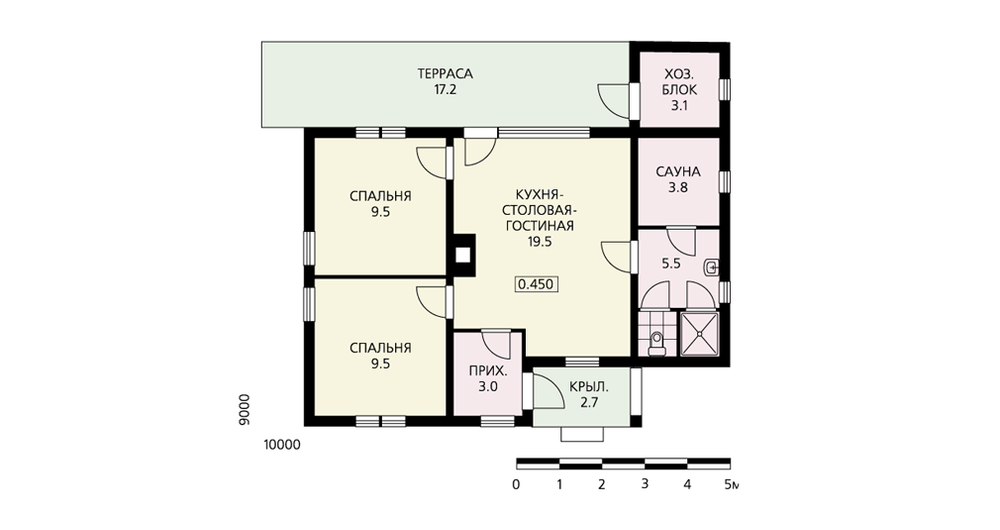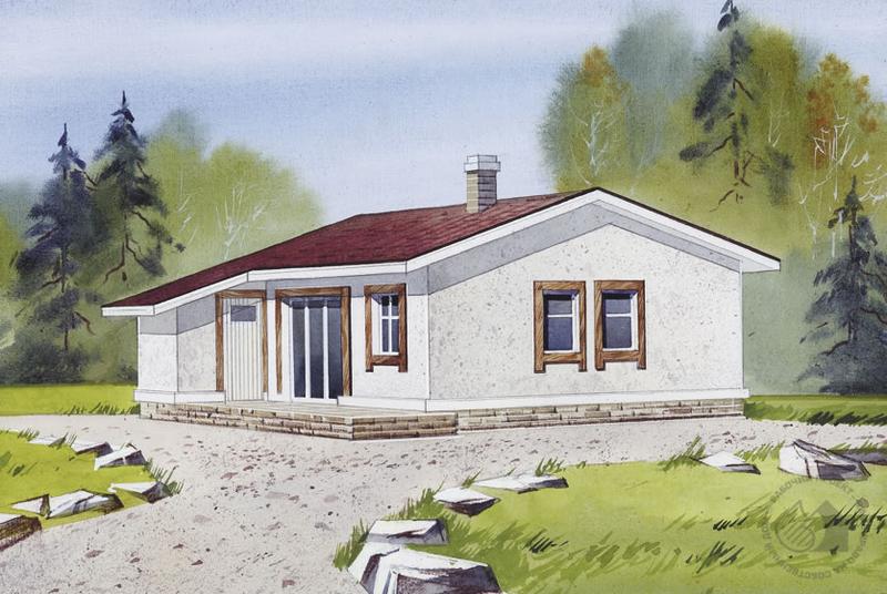 Загородный дом эконом-класса – удачное решение проблемы доступного сезонного жилья для семейной пары. Такой дом также актуален как временное жилье на период строительства основного коттеджа усадьбы. В дальнейшем он может использоваться как гостевой дом. В доме всего один этаж, отсутствуют подвал и мансарда, что избавляет от необходимости сооружать лестницу. При этом планировка дома достаточно комфортна. На очень небольшой площади удалось разместить гостиную с кухней, две спальни и даже сауну с душевой. Из гостиной есть выход на небольшую открытую террасу. Лаконичность фасадов дома под стать его планировке, никаких излишеств и украшательств. Сделать их более выразительными и привлекательными помогут современные отделочные материалы и высокое качество строительных работ.