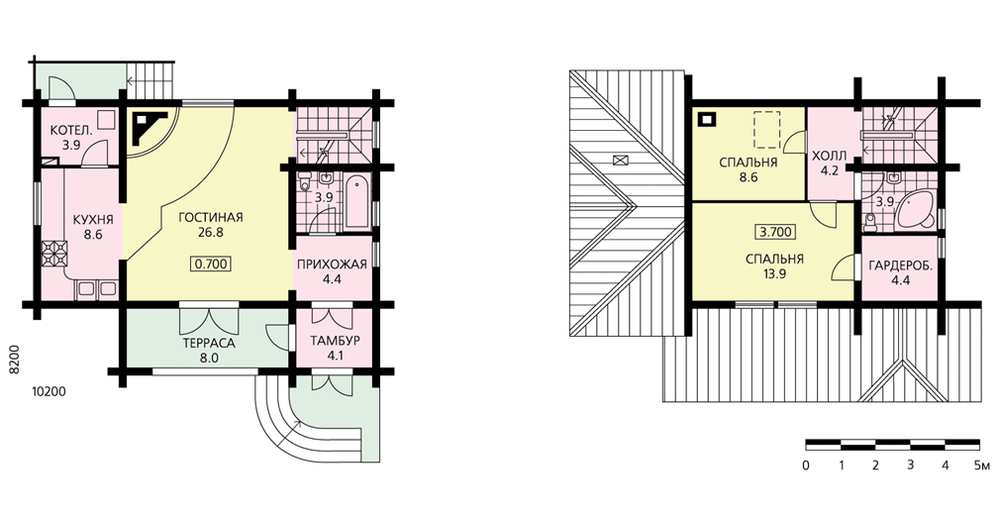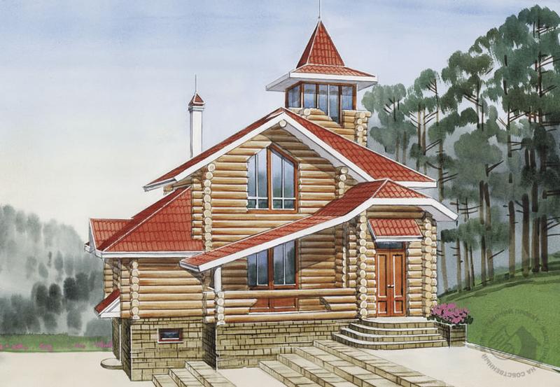 Деревянный дом со смотровой башней – достаточно редкий прием, заимствованный из архитектуры русского Севера. Но для любителей экзотики он может стать настоящей находкой. Тем более что в сочетании с многоуровневой кровлей создается нестандартный, очень выразительный образ дома. А возможность «посадки» на рельеф еще больше усиливает этот эффект. Внутренняя планировка современна и комфортабельна. Не считая смотровой башни, в доме два этажа и подвал (площадь подвала не включена в общую площадь дома). На первом этаже расположены помещения дневного пребывания: гостиная с камином, смежная с ней кухня-столовая и ванная комната. Небольшая котельная имеет отдельный выход на улицу. При входе в дом предусмотрена терраса-крыльцо. На втором, мансардном этаже на две спальни запроектированы ванная и гардеробная. Из холла мансарды можно подняться на смотровую башню.