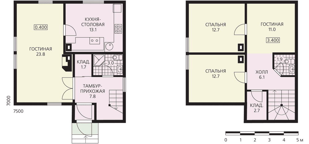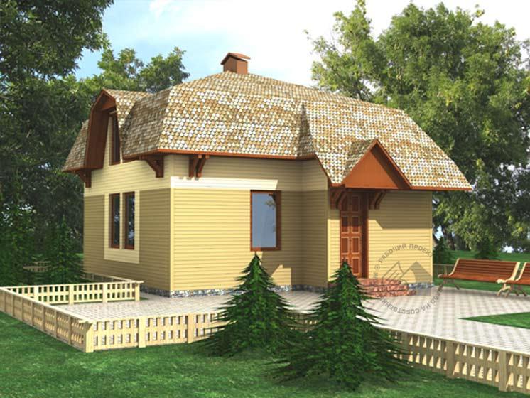 Небольшой, достаточно простой по планировке дом из бруса, который вероятнее всего будет использоваться как сезонное жилье – дача или дом для отдыха. Подвал и чердак отсутствуют, монолитная плита основания позволит построить его даже на сложных грунтах. В распоряжении владельцев дома два этажа общей площадью 96.5 м2. Но рациональная планировка позволила и на такой небольшой площади разместить пять жилых помещений и создать необходимый уровень комфорта. На первом этаже расположены достаточно большая гостиная и смежная с ней кухня-столовая. В гостиной предусмотрен камин, в кухне – печь-лежанка, в прихожей – небольшой санузел и кладовая. Котельная в доме не предусмотрена, он отапливается печью и камином. При необходимости возможно установить котел, например под лестницей. Второй этаж частично мансардный, с наклонным потолком, образованным скатами кровли, и при этом с полноценной высотой помещений. Здесь расположены две спальни и небольшая гостиная-холл. Кладовая и санузел дополняют планировку.