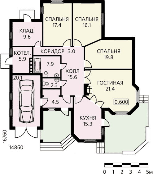 Одноэтажный дом каркасной конструкции для небольшой семьи спроектирован для ровных участков с высоким уровнем грунтовых вод. Преимуществами одноэтажных домов вообще, как и предлагаемого, являются отсутствие внутриквартирных лестниц, экономичные фундаменты, монтаж конструкций без использования крана или с минимальным его использованием. Однако габаритные размеры таких домов, как правило, достаточно велики, что ограничивает их использование на малоразмерных участках. Минимальная рекомендуемая площадь земли – 0.12 га.