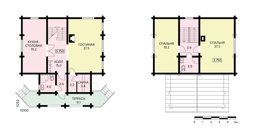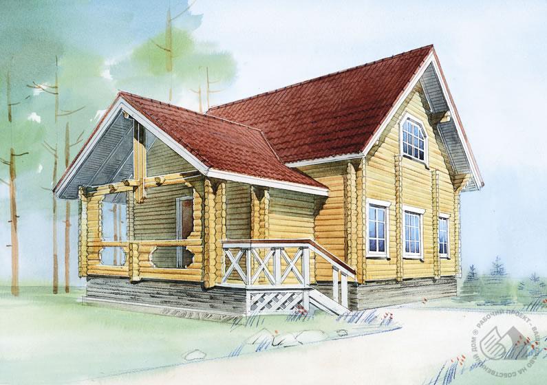 Образ этого небольшого деревянного дома создается преобладанием элементов северного народного жилища. Простота и сдержанность внешнего облика хорошо сочетаются с логичностью и функциональностью планировочного решения: гостиная с камином и кухня-столовая расположены по разные стороны от холла-прихожей, из которого можно попасть на второй этаж; сауна – необходимое дополнение для комфортного отдыха. Дом экономичен, прост в исполнении и экологичен, так как материалом стен является деревянный брус. Строительство дома можно вести в два этапа – на начальном этапе вместо блока помещений при входе может быть крытая терраса.