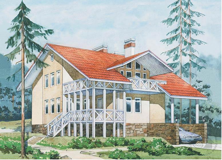 Перед вами достаточно редкий очень удачный пример строительства большого, комфортабельного дома, рассчитанного на постоянное проживание многочисленной семьи, из бруса. Как правило, этот материал предлагается для небольших, сезонных построек. Использование бруса как основного материала ограждающих конструкций делает этот дом экологичным и достаточно экономичным. Внутренняя планировка дома отличается наличием больших, наполненных светом и воздухом пространств. На первом этаже это пространство гостиной, холла и кухни-столовой, общая площадь которого составляет 70.0 м2, в мансарде это холл, который имеет выход на террасу и балкон. Он может служить второй, дополнительной гостиной в доме, а может быть переоборудован под спальную комнату.