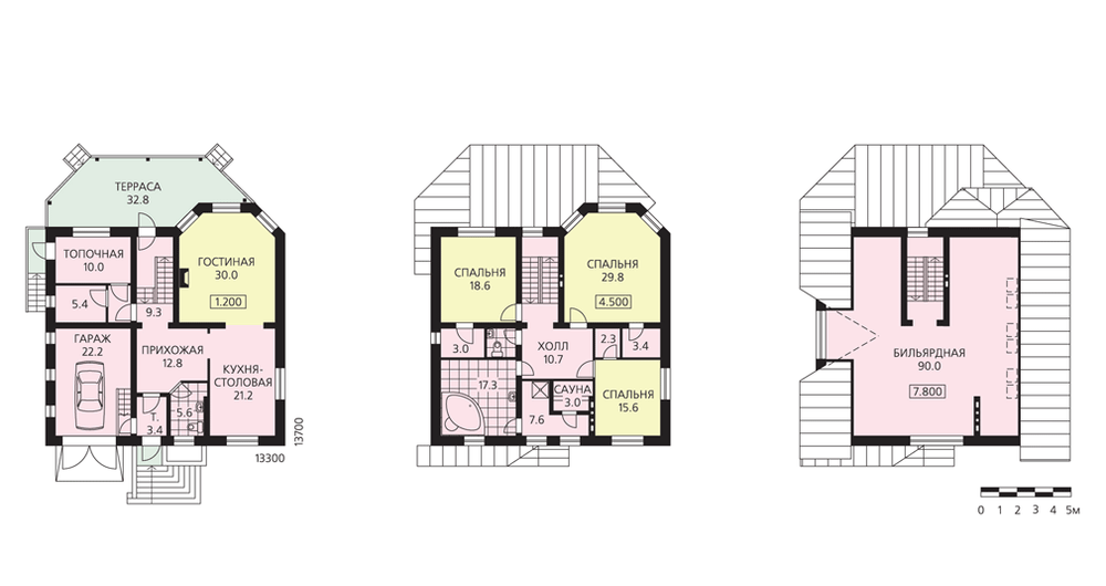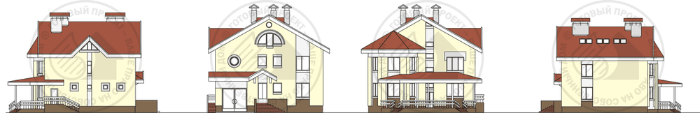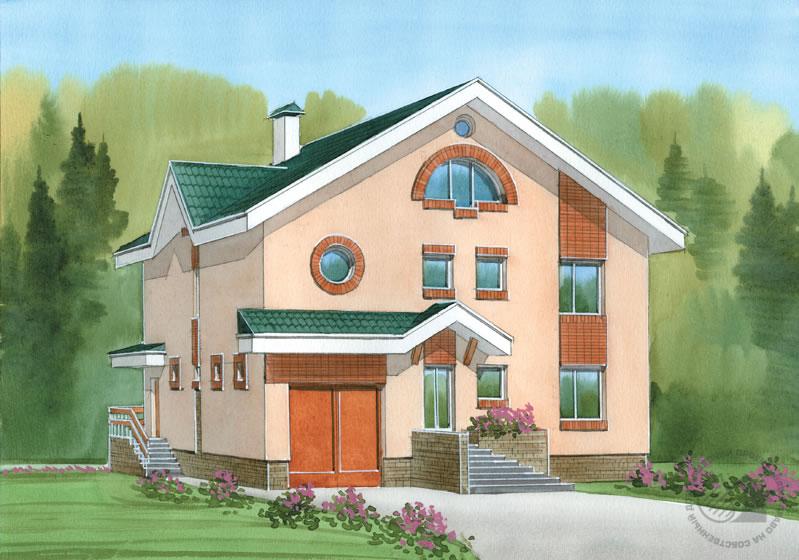 Дом с эркером и великолепной крытой террасой. И хотя эти элементы находятся на дворовом фасаде, именно они формируют облик дома. Терраса – гармоничное продолжение внутреннего пространства, она как бы связывает его с окружающей средой и служит гостиной под открытым небом. С нее организован второй вход в дом. Основной же вход ведет с высокого парадного крыльца главного фасада. На первом этаже расположены кухня-столовая, гостиная, топочная со своим выходом на улицу и встроенный гараж. По лестнице из холла можно подняться на второй этаж. Здесь находится спальная зона дома, планировка которой соответствует самым высоким требованиям комфорта. Каждая из трех спален имеет свою гардеробную. Просторная ванная комната сблокирована с помещением сауны и душевой. По проекту мансардный этаж отведен под бильярдную, но здесь вполне может быть оборудована студия или мастерская художника.