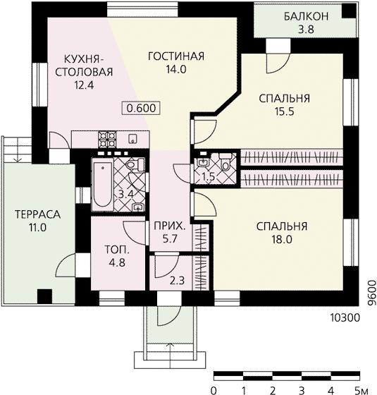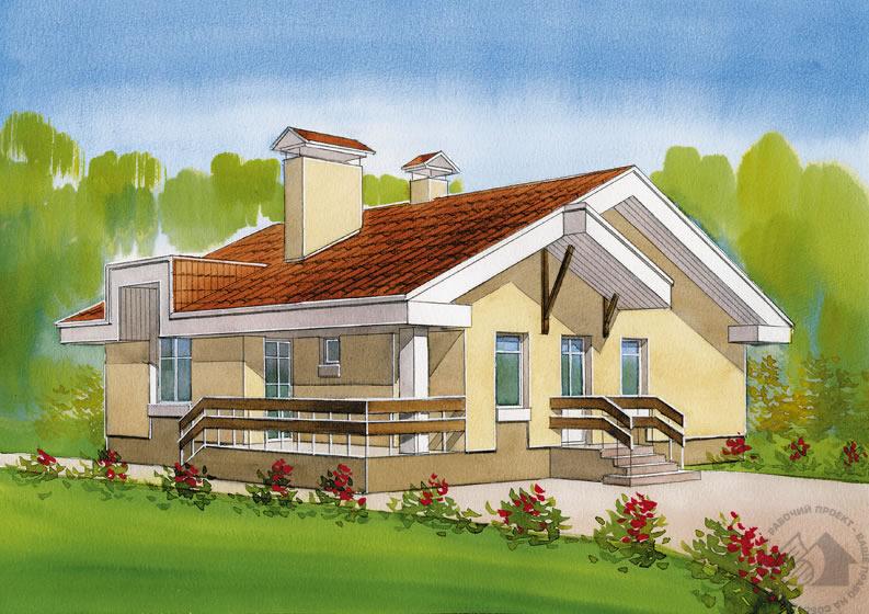 Удачный пример небольшого одноэтажного дома, в котором удалось разместить все необходимые для жизни семьи помещения. На одном этаже расположены гостиная, кухня-столовая, две спальни, ванная и топочная. При этом помещения очень удобно сгруппированы, что делает планировку этого небольшого дома еще и достаточно комфортабельной. А соотношение общей и жилой площадей говорит о ее максимальной рациональности, в доме практически отсутствуют коридоры и прочие транзитные зоны. Не съедается площадь и за счет лестницы, неизбежной в многоэтажной постройке. Объединение гостиной и кухни-столовой позволяет создать достаточно большое по площади помещение гостевой зоны. Смежная с ним крытая терраса может использоваться как летняя столовая. Спальни сблокированы и оборудованы встроенными шкафами, из одной есть выход на балкон. Подвал в доме отсутствует, небольшой чердак не эксплуатируется.
