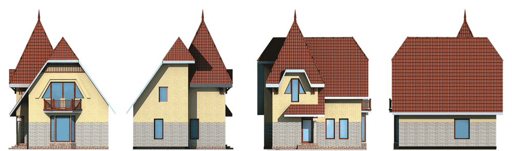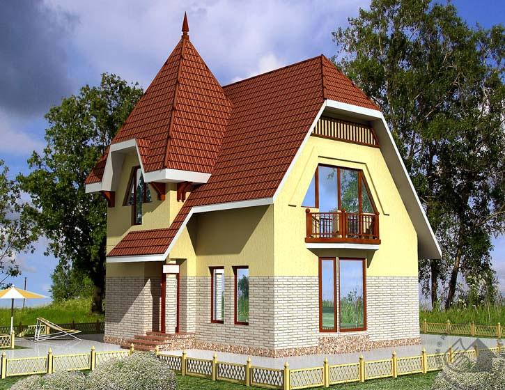 Дом эконом-класса с компактной планировкой и высокой кровлей, своим обликом напоминающий сказочный теремок. Снаружи очень небольшой, внутри достаточно вместителен и комфортен. На площади чуть более 100 м2 размещены гостиная, кухня-столовая и три спальни – всего пять достаточно просторных помещений, не считая прихожей и холла. При этом выдержано четкое поэтажное зонирование, первый этаж – гостевая зона дома, мансарда – спальная. Монолитная плита в основании дома позволит возводить его на сложных грунтах. Монолитные и деревянные балки использованы и в конструкции перекрытий. Это позволит избежать использования тяжелой строительной техники, неизбежной при наличии фундаментных блоков и плит перекрытия. Компактное пятно застройки позволит посадить дом и на маленький участок. Добавьте к этому недорогой и эффективный материал наружных стен, и вы не сможете отказаться от этого замечательного дома.