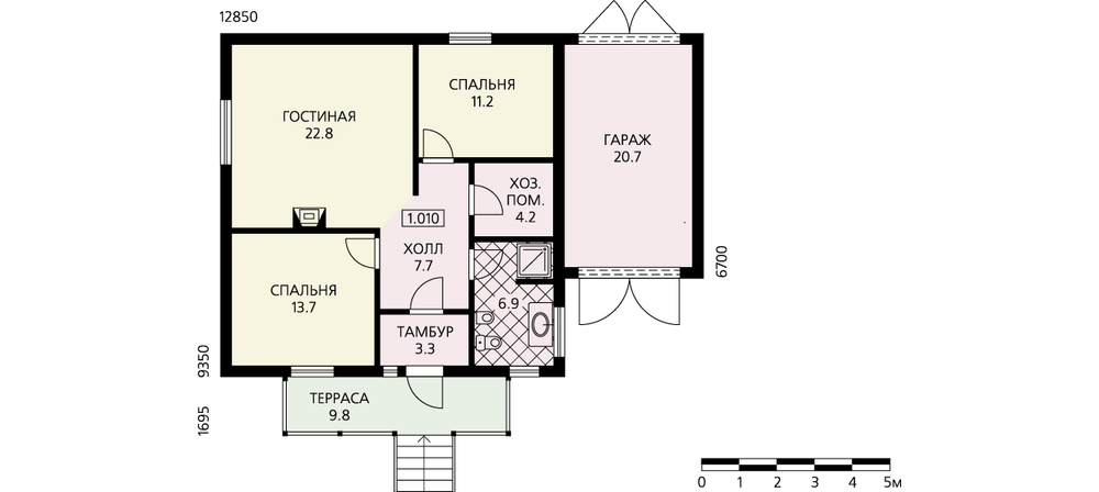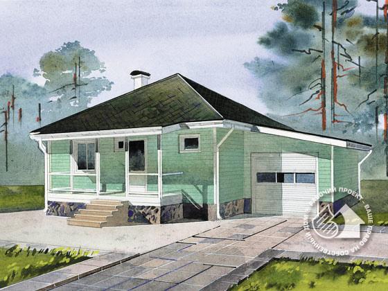 Небольшой каркасный дом – идеальное решение сезонного жилья для семьи со средним достатком. Он компактен и рационален по планировке. Каркасная конструкция быстро возводима и экономична. При этом планировка достаточно комфортабельна и обеспечивает все условия для полноценного отдыха. Вход в дом предваряет крытая терраса, затем тамбур и холл – распределительная зона дома. Отсюда можно попасть во все его помещения: гостиную, столовую, спальню, ванную комнату и небольшое хоз. помещение. Эксплуатируемым является один первый этаж, эксплуатация чердака по проекту не предусмотрена. Справа от входа к дому пристроен гараж. Это одноэтажная пристройка с односкатной кровлей. Интересна организация сквозного проезда, с двумя противоположно расположенными воротами, что функционально оправданно и очень удобно.