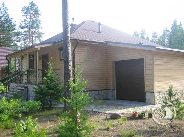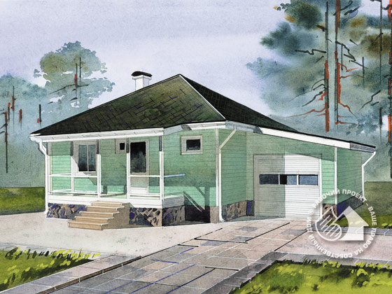 для семьи со средним достатком. Он компактен и рационален по планировке. Каркасная конструкция быстро возводима и экономична. При этом планировка достаточно комфортабельна и обеспечивает все условия для полноценного отдыха. Вход в дом предваряет крытая терраса, затем тамбур и холл – распределительная зона дома. Отсюда можно попасть во все его помещения: гостиную, столовую, спальню, ванную комнату и небольшое хоз. помещение. Эксплуатируемым является один первый этаж, эксплуатация чердака по проекту не предусмотрена. Справа от входа к дому пристроен гараж. Это одноэтажная пристройка с односкатной кровлей. Интересна организация сквозного проезда, с двумя противоположно расположенными воротами, что функционально оправданно и очень удобно.