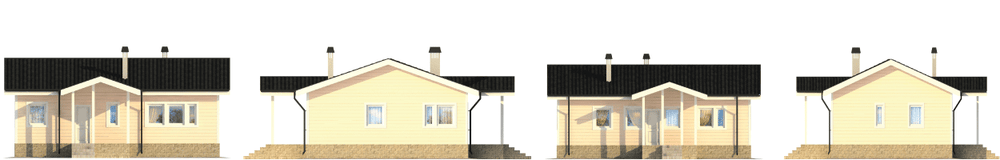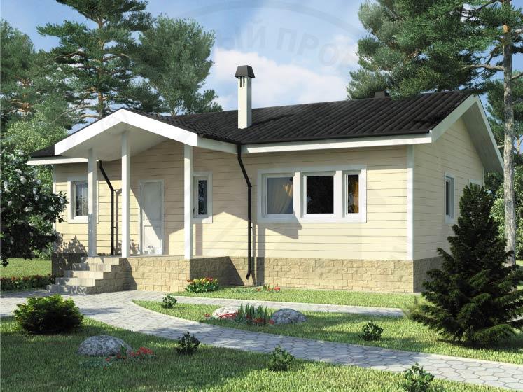 Небольшой каркасный домик для сезонного проживания, с отделкой блок-хаусом, который можно использовать и как дачную постройку, и для застройки туристической зоны. Коттедж одноэтажный, без чердака, высота потолка за счет использования подкровельного пространства достигает почти четырех метров в самой высокой точке. Все необходимые для жизни и отдыха помещения очень компактно и удобно размещены в доме - просторный холл, гостиная, объединенная с кухней, комната отдыха, сауна и две спальни. Запроектирован он единым тепловым контуром, от пола до самой крыши, что стало осуществимо за счет современной технологии использования термопанелей.