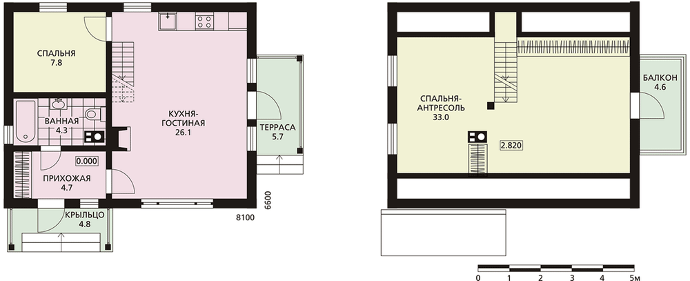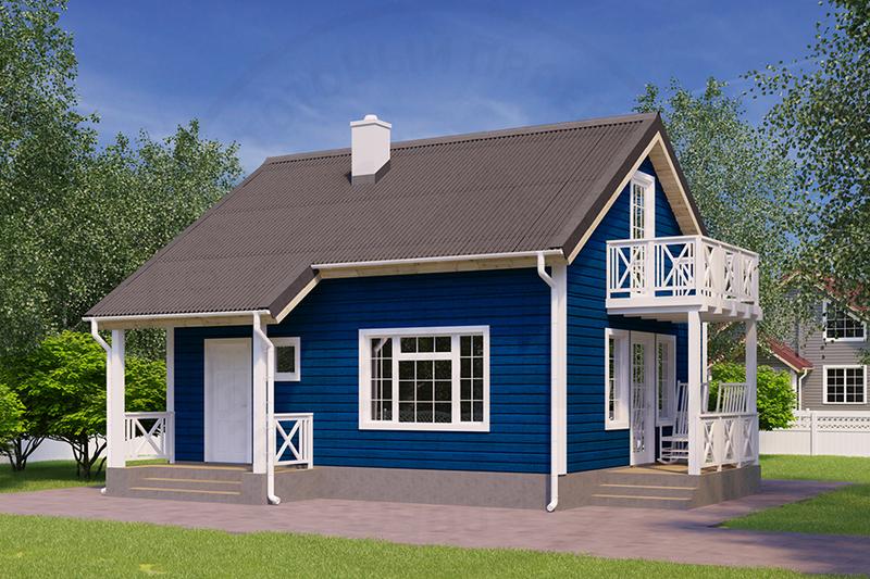 Двухэтажный компактный брусовой домик оптимально подойдет для сезонного проживания небольшой семьи. При этом даже в холодное время в коттедже будет комфортно и тепло: здесь есть камин, а стены по проекту утепляются минеральной ватой. В доме может разместиться не только небольшая семья, но и гости: второй этаж занимает просторная спальня-антресоль.