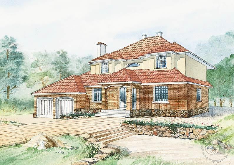 Архитектура этого дома подчеркнуто традиционна. Элементами внешнего декора служат строго симметричные окна, стеклянная полубашня эркера, вместившая веранду и лоджию, арка над парадным входом, пилястры второго этажа. Планировка здания не вызывает сомнений в том, что это – комфортабельная вилла: гараж на два автомобиля, спортзал и сауна – в цокольном этаже; большая с камином гостиная и гостевая комната – на первом; наверху – три спальни, две из которых сообщаются с лоджией, и просторная ванная комната. Картину завершает мансарда над гаражом. Существует два варианта второго этажа: один в кирпиче и другой, предлагаемый вашему вниманию, в брусе.