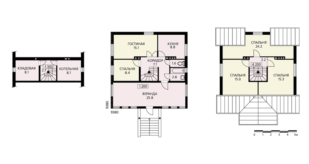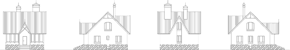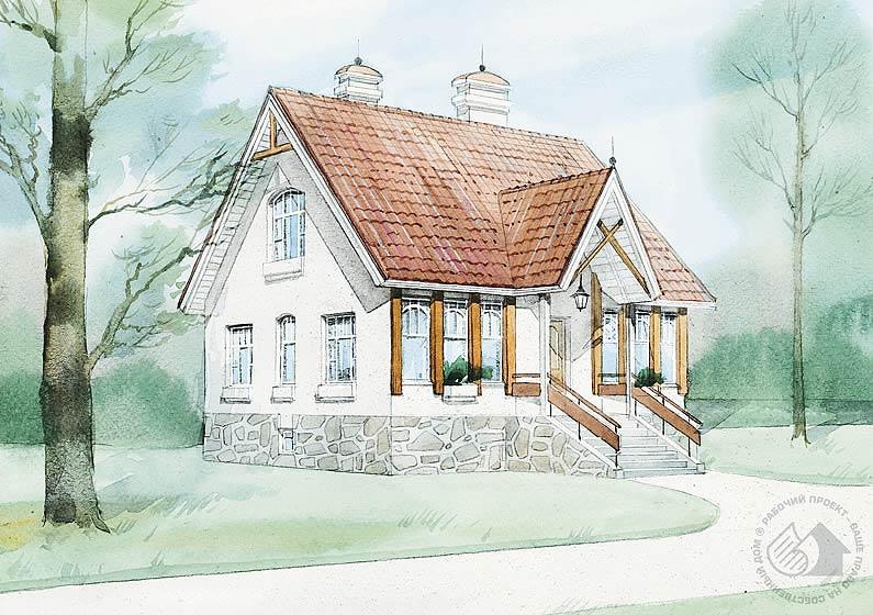 Особенностью этого пятикомнатного дома из бруса с облицовкой кирпичом является компоновка всех помещений вокруг внутреннего пространства с лестницей, ведущей в мансарду и подвал. Рациональное зонирование (помещения дневного пребывания – гостиная, кухня, гостевая комната и ванная с санузлом на первом этаже и три жилые комнаты в мансардном) делает этот компактный дом пригодным для сезонного и постоянного проживания семьи. В доме предусмотрено отопление от водогрейного котла, расположенного в подвале. Облицовка цоколя естественным камнем, причудливое оформление дымовой и вентиляционной труб, сложная пластика крыши создают образ надежного семейного жилища.