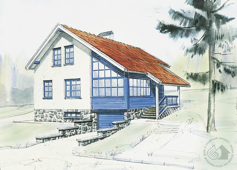 Компактный, очень практичный мансардный дом из кирпича, который может служить как постоянным, так и сезонным жильем для небольшой семьи. Компактные по размерам помещения жилой части дома дополнены хорошо разработанной хозяйственной зоной, размещенной в цокольном этаже. Подсобные помещения связаны с гаражом, имеют выход непосредственно на участок и лестницу, ведущую в прихожую первого этажа. Такая планировка особенно удобна для тех, кто занимается возделыванием сада или огорода. Планировка дома такова, что он может строиться в два этапа: сначала основной объем, а затем гараж с верандой и крыльцом.